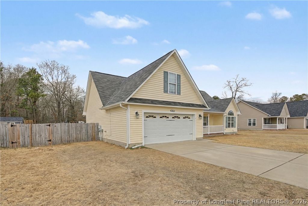NO HOA. This beautiful ranch style house w/bonus is located in the Carolina Oaks neighborhood. This home features an open floor plan with a stunning cathedral ceiling in the great room, creating a bright and spacious feel. The fireplace is equipped with gas logs (currently not connected by the present owner). The dining and kitchen combination offers attractive tiled flooring, a breakfast bar, stylish backsplash, stainless steel appliances, and an open view into the great room???perfect for both everyday living and entertaining. The primary suite boasts a trey ceiling, walk-in closet, and a private bath complete with double sinks, a relaxing garden tub, and a separate tiled shower. Step outside through the sliding glass doors to a patio overlooking a large, privacy-fenced backyard. Additional features include a sprinkler system, gutters, and a spacious front porch ideal for sitting and relaxing. Located less than 25 minutes from Fort Bragg.